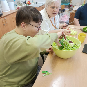 Podczas przerwy od zajęć Adrian, Mariolka, Agnieszka, Emil i Ewelinka wspólnie z Anetką, instruktorką pracowni rękodzieła, przygotowali pyszną, zdrową sałatkę.